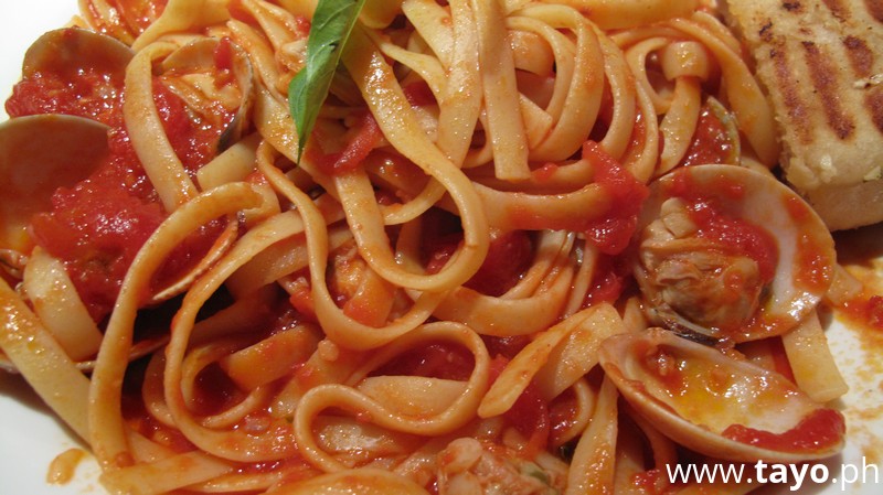 * "shelter in" clams tossed in red sauce and fettuccine pasta.